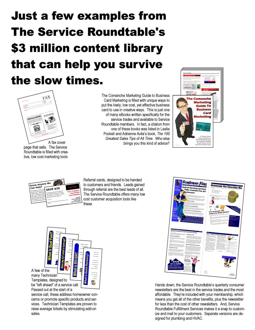 No one gives you the array of sales, marketing, and business tools that the Service Roundtable offers. These have turned around more than one contractor’s business. They can keep yours going through tough times. Read what other contractors have to say about the Service Roundtable.